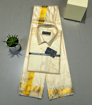 Mens Japan Silk Checks Pattern Embossed Dhoti & Shirt Combo