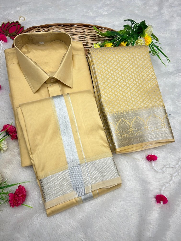 Couple Combo Art Silk – Biscuit Gold Silver Combo