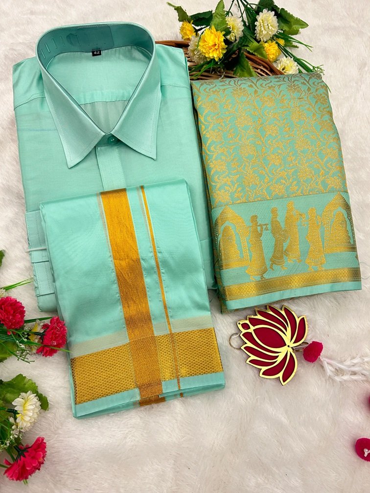 Couple Combo Art Silk – Mint Green Gold Combo