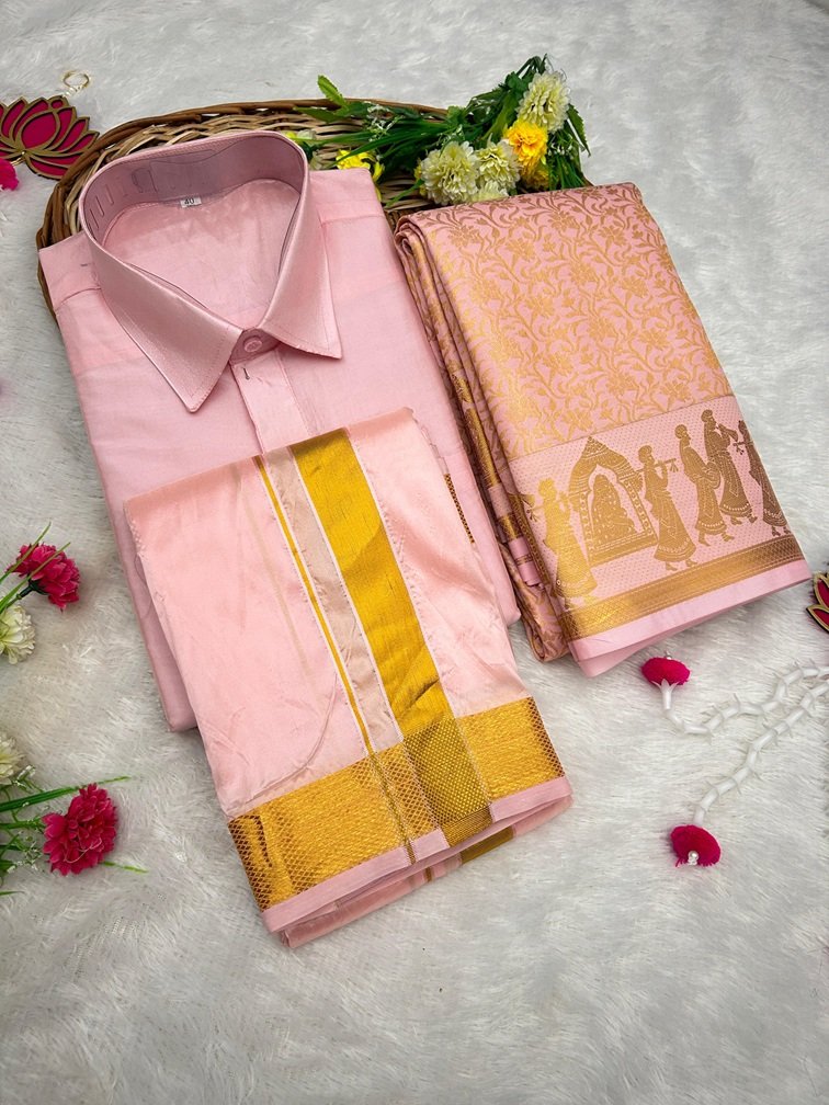 Couple Combo Art Silk – Pastel Pink Gold Combo