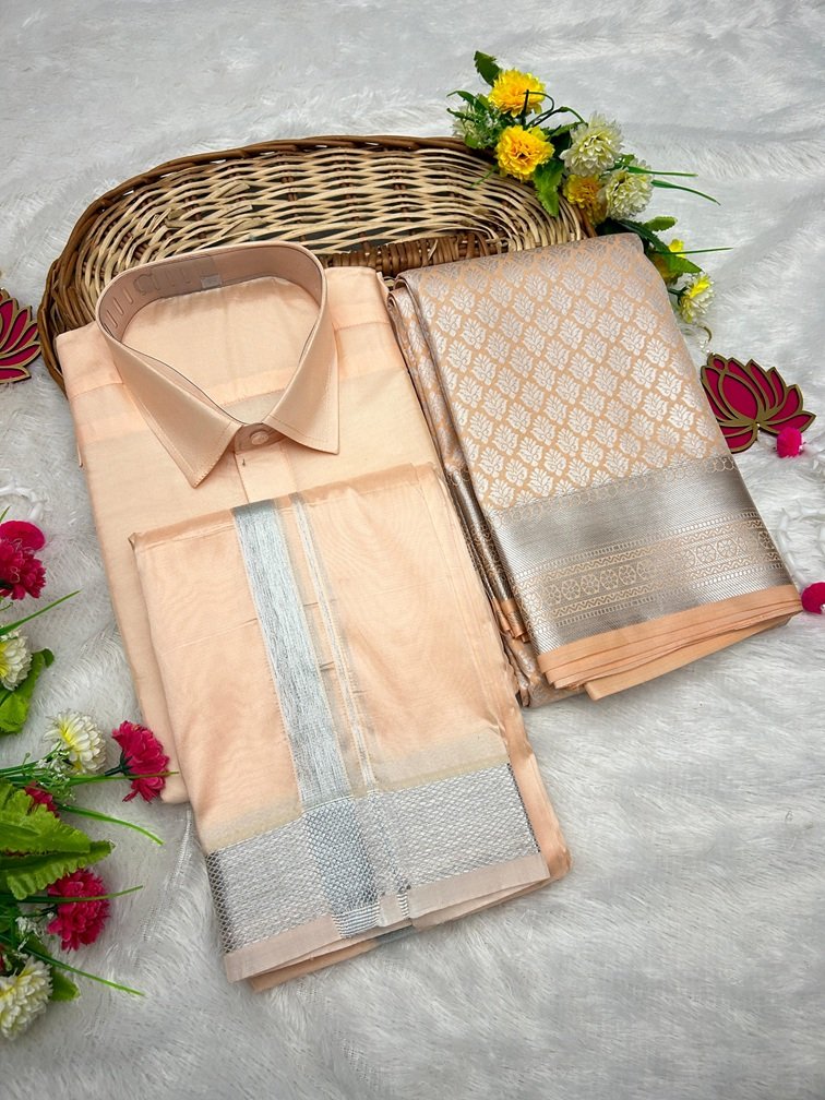 Celebrate tradition in style with our Couple Combo Set, featuring a men’s art silk dhoti shirt set and a soft silk saree in matching colors. Designed for elegance, this exquisite pair ensures a regal, coordinated look for weddings and festive occasions.