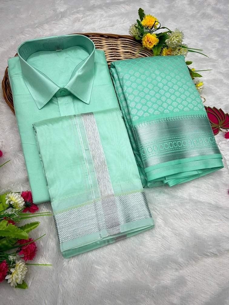 Celebrate tradition in style with our Couple Combo Set, featuring a men’s art silk dhoti shirt set and a soft silk saree in matching colors. Designed for elegance, this exquisite pair ensures a regal, coordinated look for weddings and festive occasions.