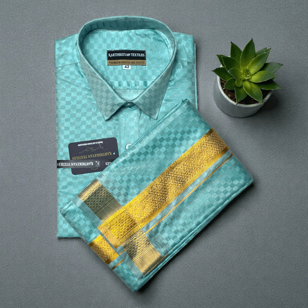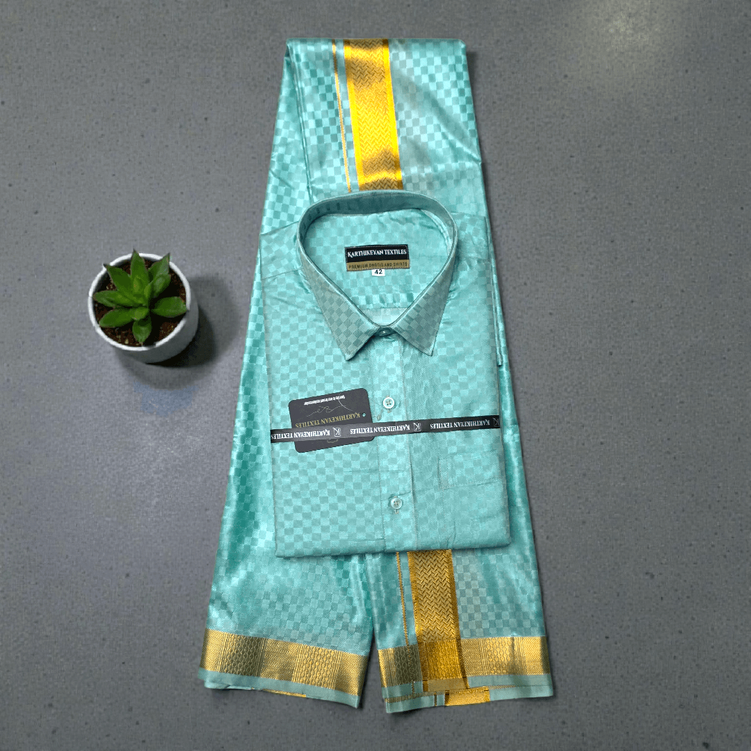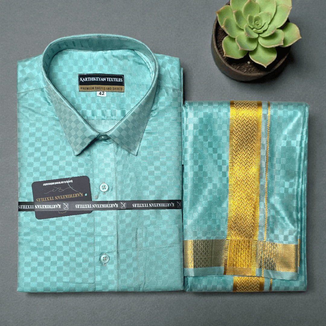 Mens Japan Silk Checks Pattern Embossed Dhoti & Shirt Combo