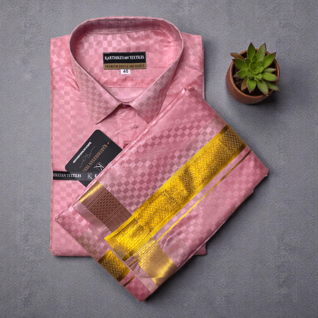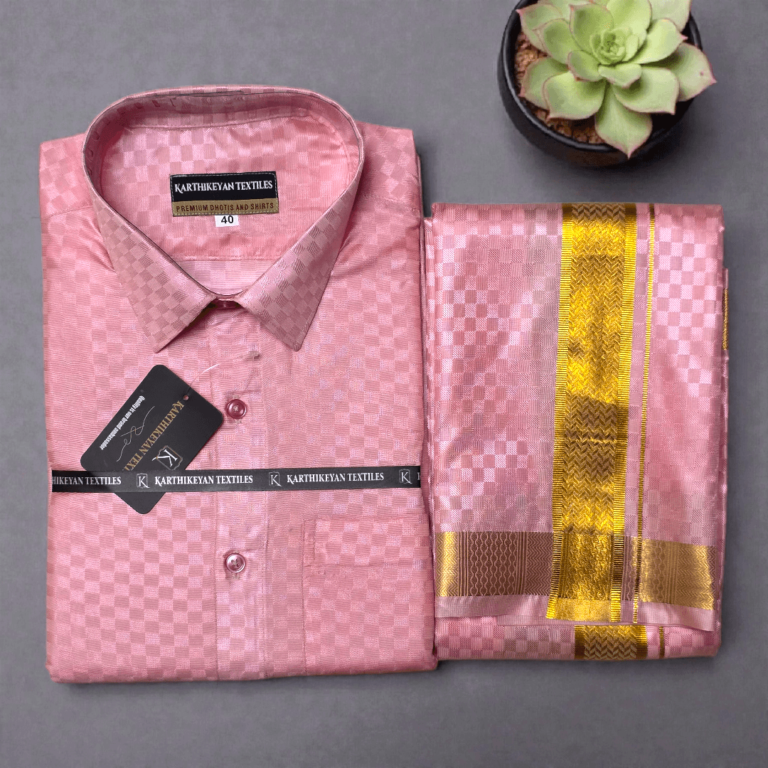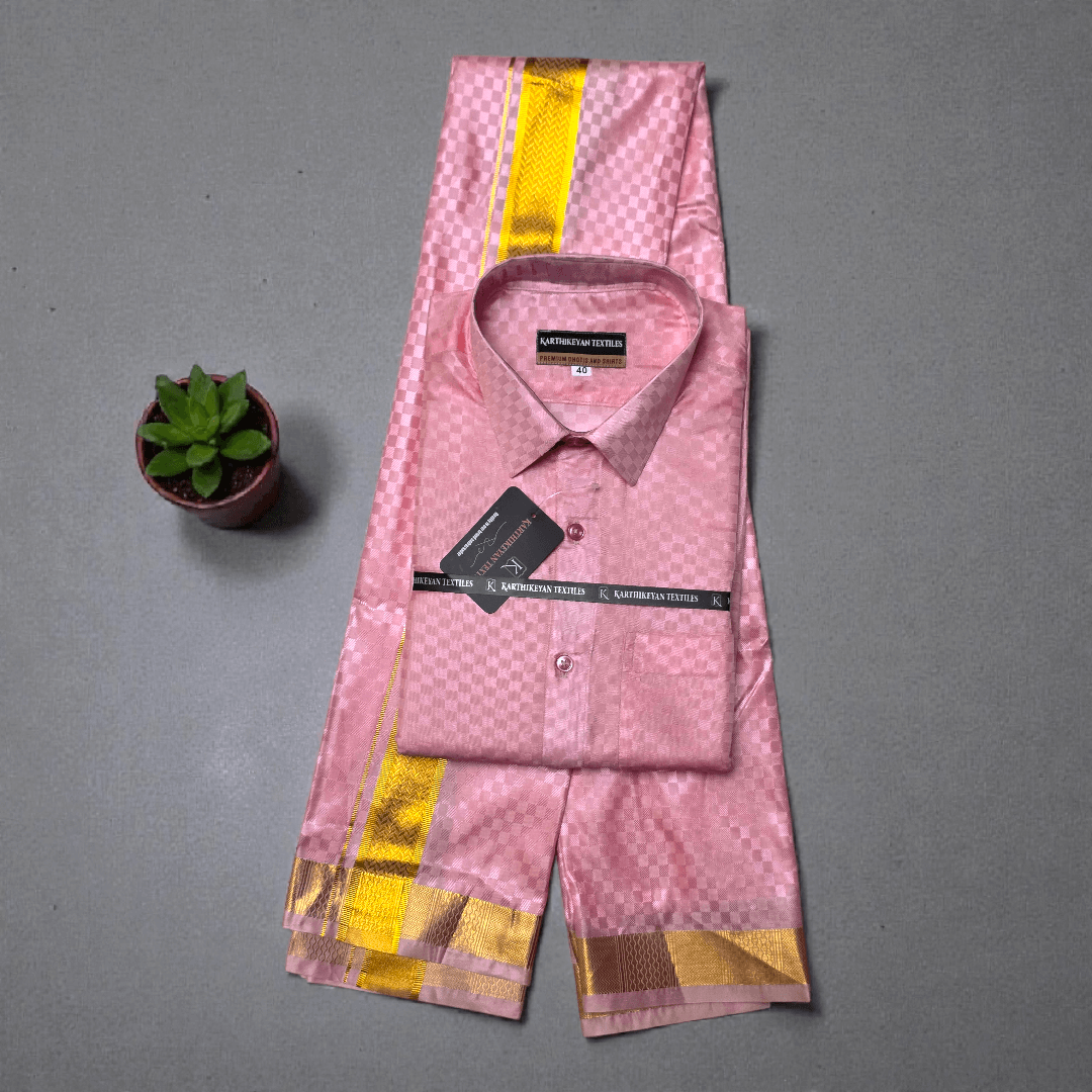 Mens Japan Silk Checks Pattern Embossed Dhoti & Shirt Combo