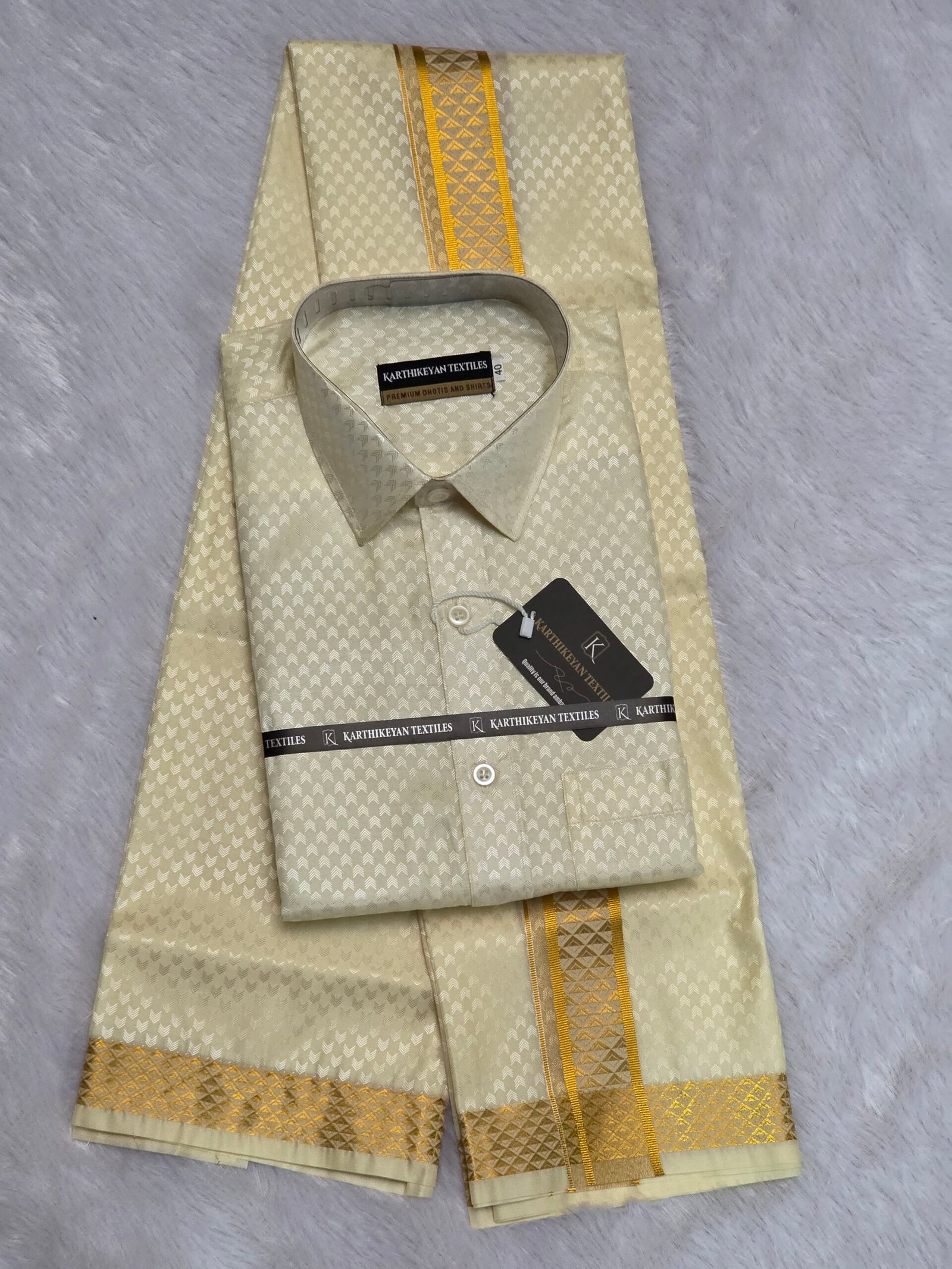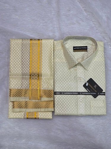 Mens Japan Silk Cream Arrow Pattern Embossed Dhoti & Shirt Combo