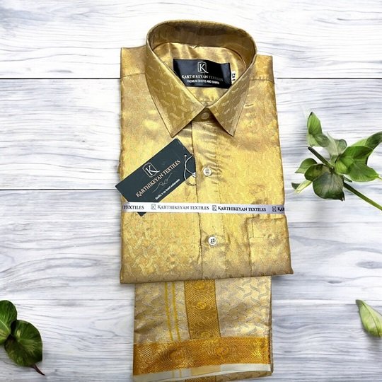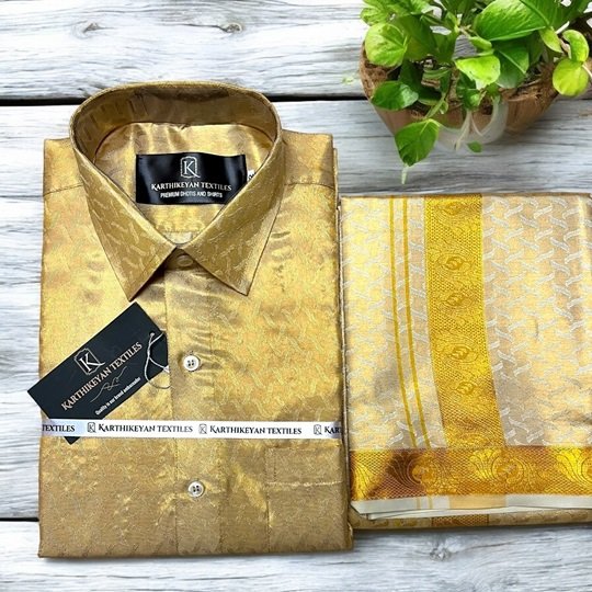 Upgrade your ethnic wardrobe with our men’s embossed Tissue silk shirt and dhoti combo. Luxurious texture, elegant design, and unmatched comfort make it perfect for weddings, festivals, and special celebrations.