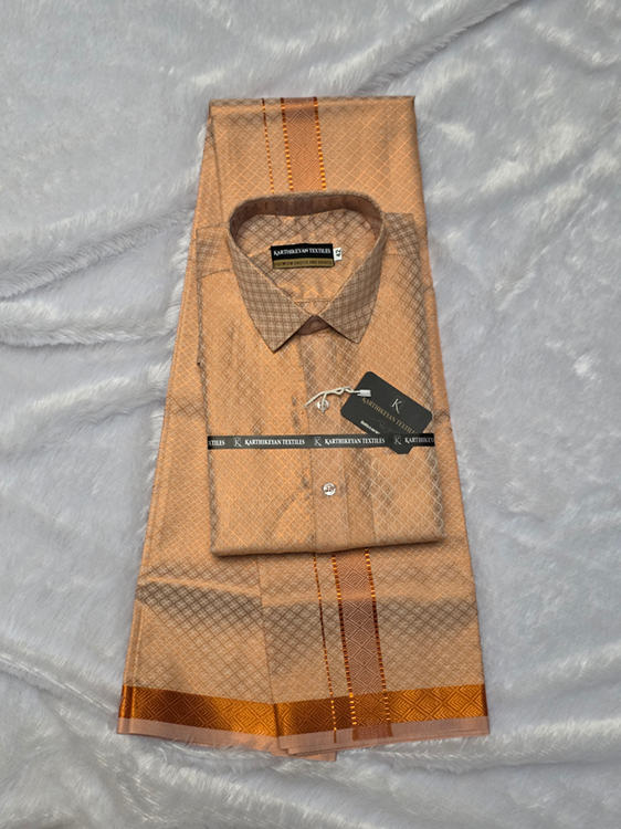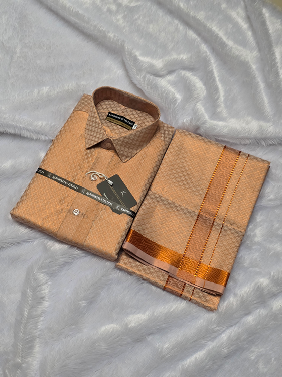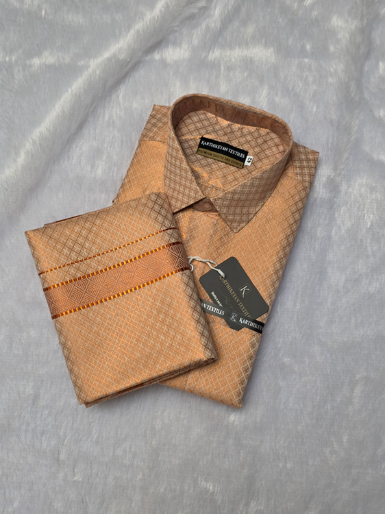 Mens Tissue Full Jari X Pattern Shirt and Dhoti Combo – Copper