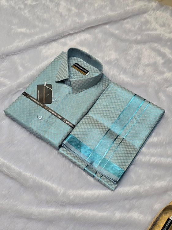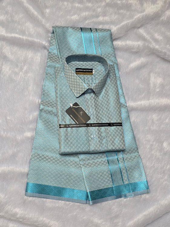 Mens Tissue Full Jari X Pattern Shirt and Dhoti Combo – Cyan Blue