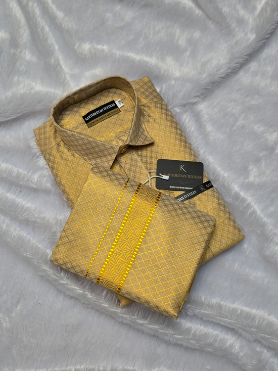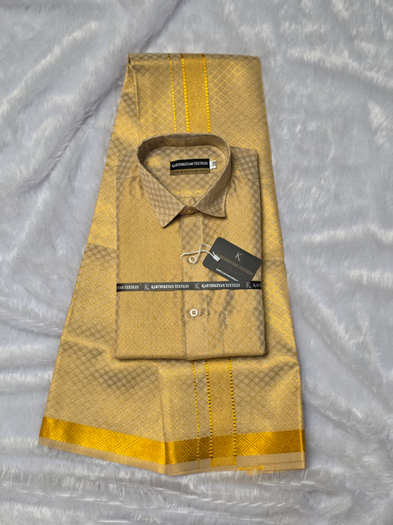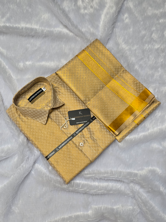 Mens Tissue Full Jari X Pattern Shirt and Dhoti Combo – Gold