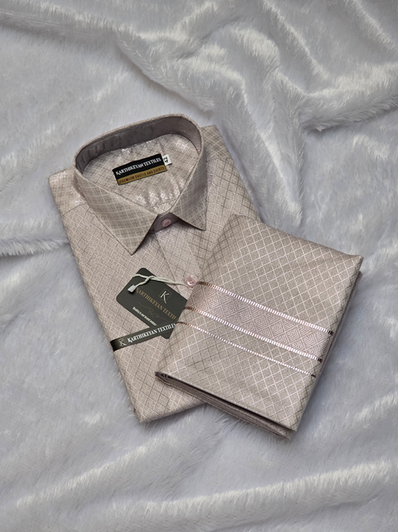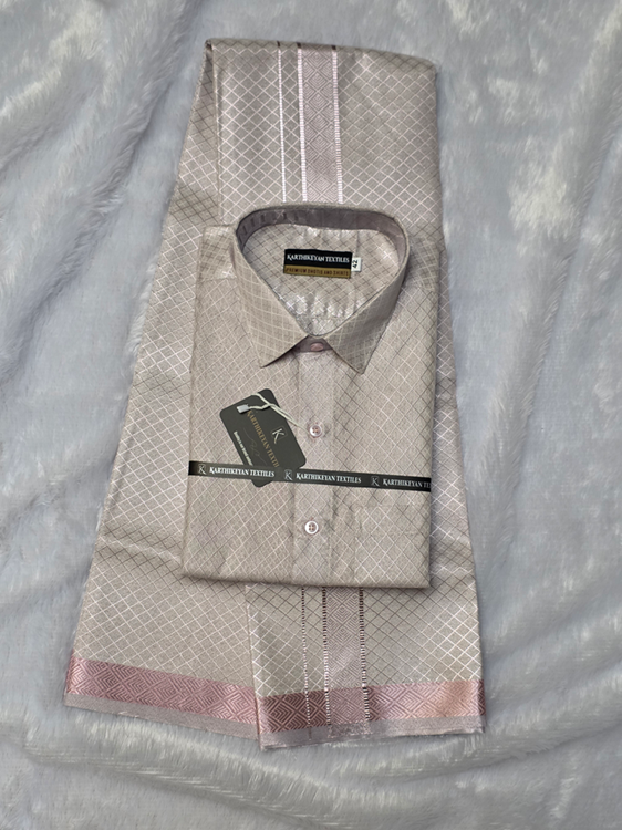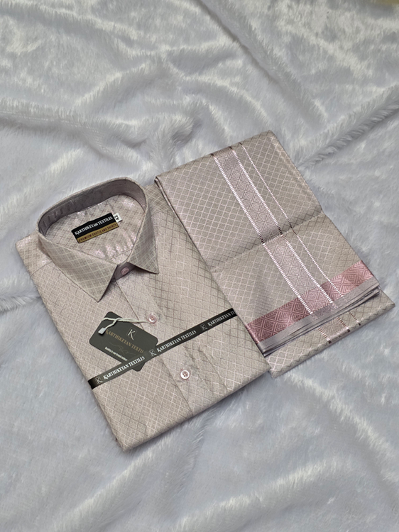 Mens Tissue Full Jari X Pattern Shirt and Dhoti Combo – Rose Pink
