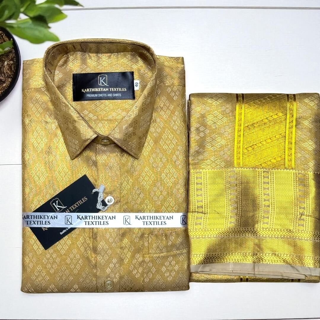 Introducing our Men’s Tissue Silk jacquard Dhoti Shirt Combo, a stylish fusion of tradition and modernity. Featuring a shimmering gold tissue dhoti with a jari border and a chic shirt, this lightweight, luxurious ensemble is perfect for weddings, festivals, and formal events, offering unparalleled elegance and contemporary charm in every detail.