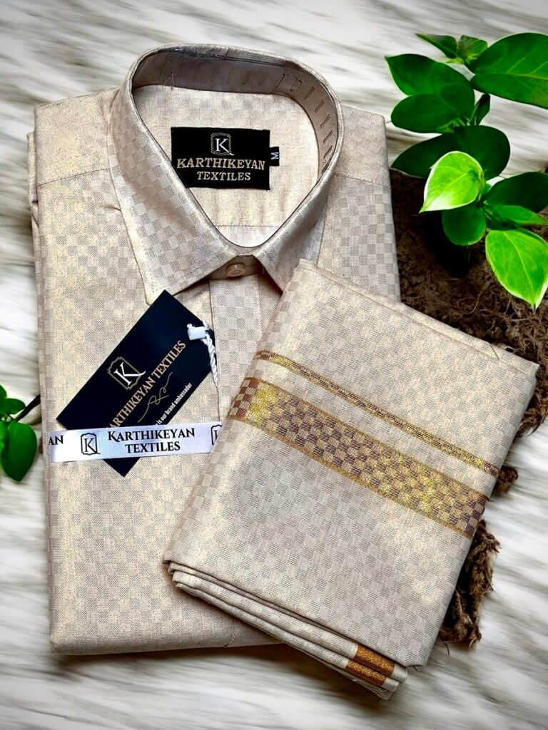 Introducing our Men’s Tissue Flexi Dhoti Shirt Combo, a stylish fusion of tradition and modernity. Featuring a shimmering copper tissue dhoti with a jari border and a chic shirt, this lightweight, luxurious ensemble is perfect for weddings, festivals, and formal events, offering unparalleled elegance and contemporary charm in every detail.
