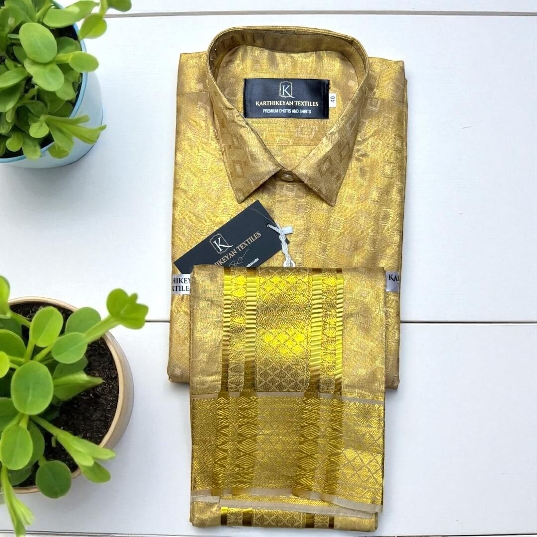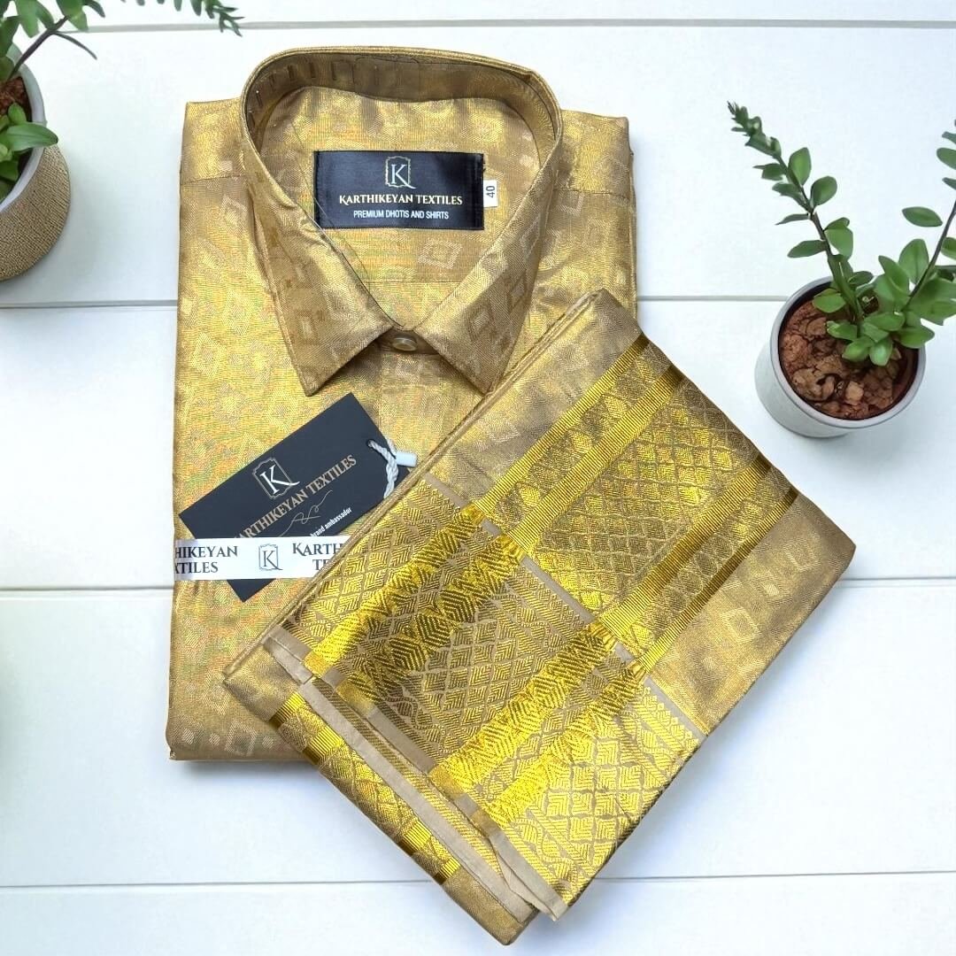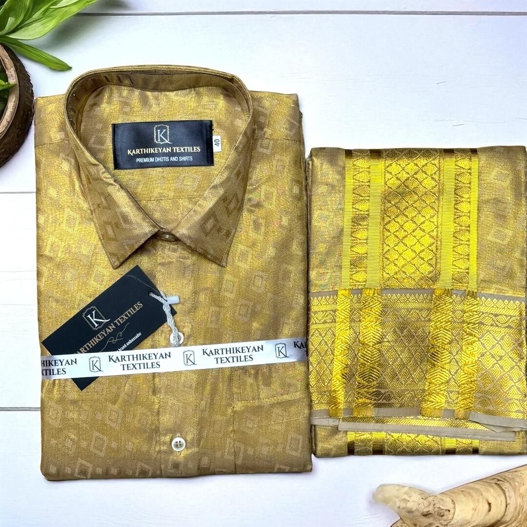 Introducing our Men’s Tissue Silk jacquard Dhoti Shirt Combo, a stylish fusion of tradition and modernity. Featuring a shimmering gold tissue dhoti with a jari border and a chic shirt, this lightweight, luxurious ensemble is perfect for weddings, festivals, and formal events, offering unparalleled elegance and contemporary charm in every detail.
