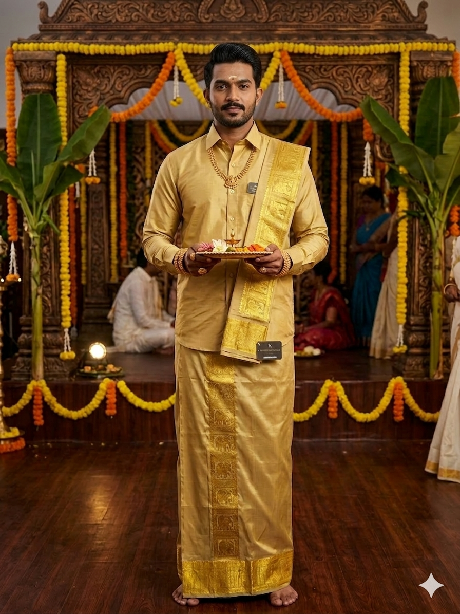 Introducing our Men’s Exclusive wedding Collection, A Pure Tradition with Quality. Featuring Full Embossed tissue dhoti with a Golden jari border with a Ethinic shirt and Matching Angavastram combo Set, this lightweight, luxurious ensemble is perfect for weddings, festivals, and Special events, offering unparalleled elegance and contemporary charm in every detail.