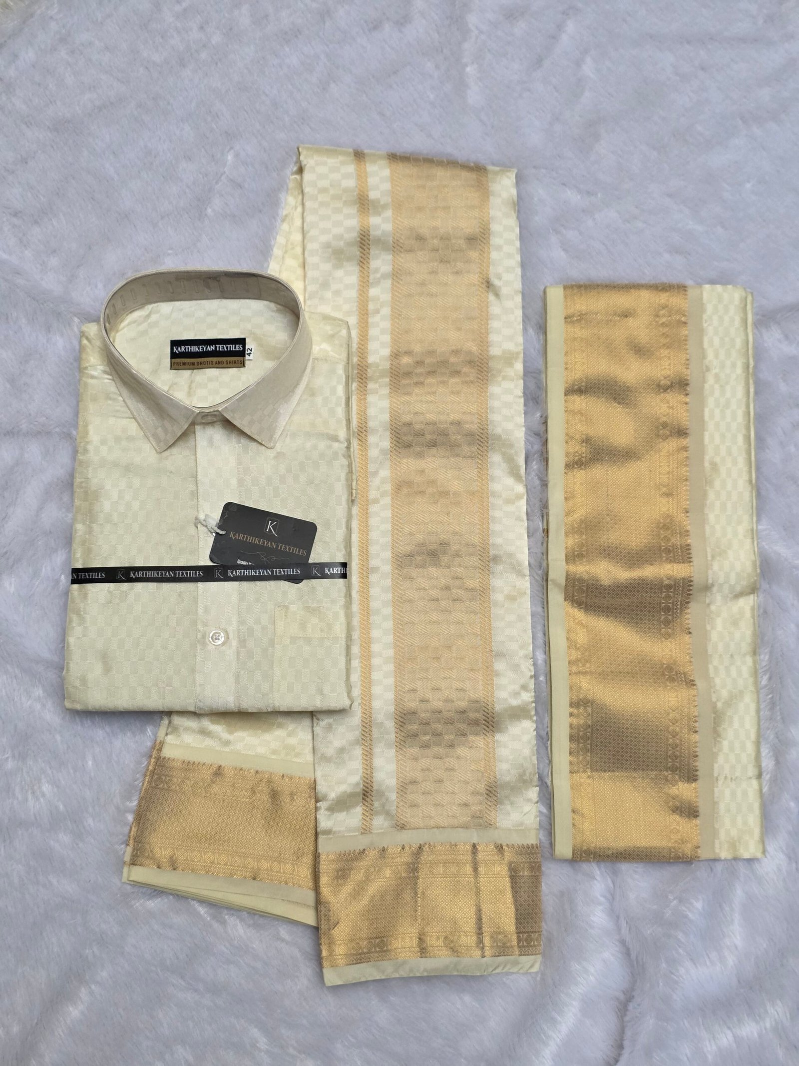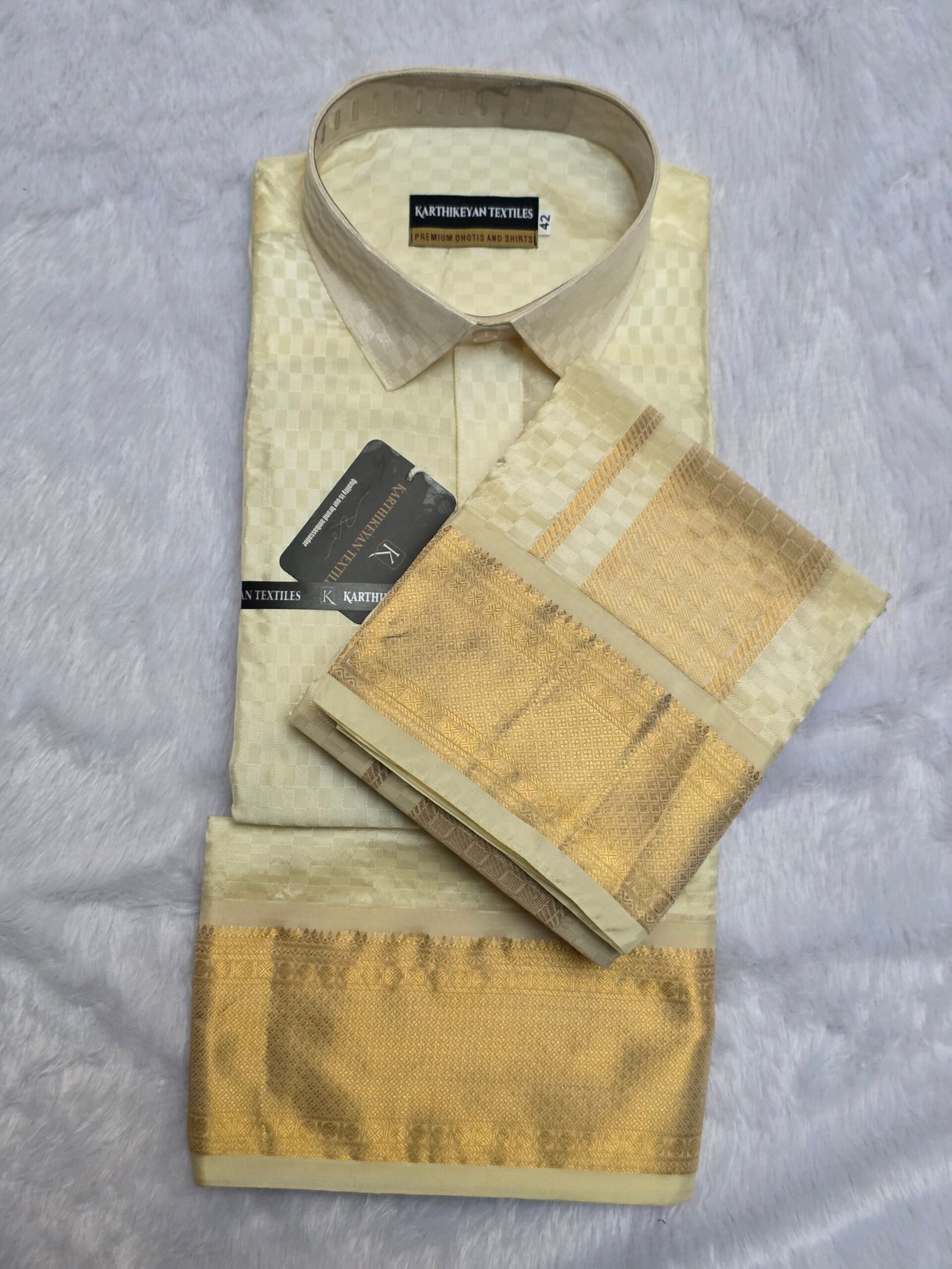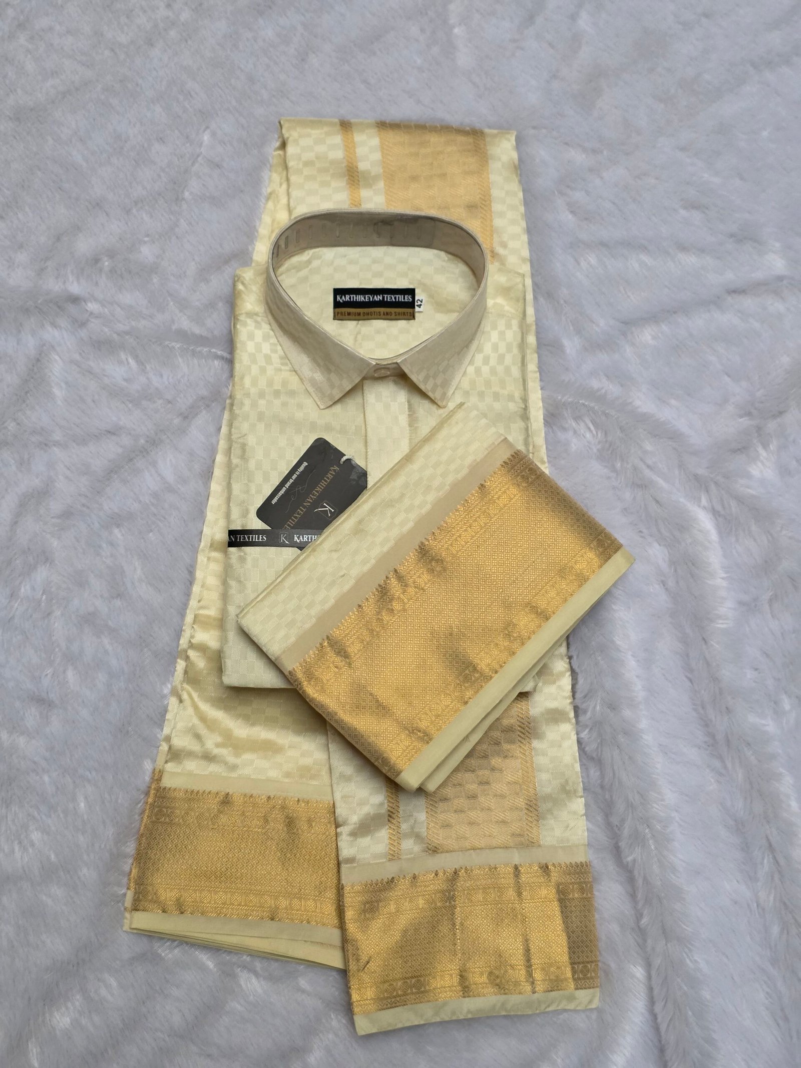 Style: Shirt, Dhoti & Towel| Material: Tissue